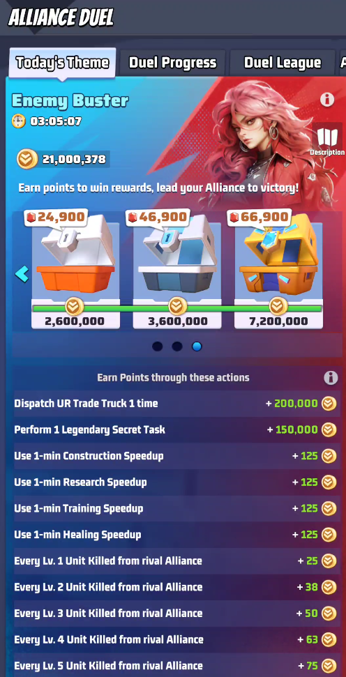 If you're nearing the end of Duel VS and still need points to unlock chests, and your alliance is winning comfortably, you may consider sacrificing troops against higher HQs to farm unit losses and earn points.